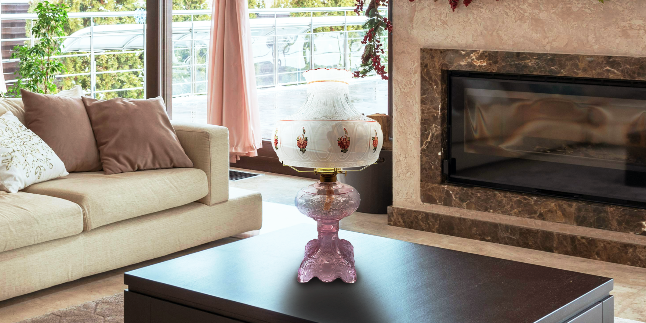 Light of Mine - Princess Feather Oil Lamp Replacement Kit Including 10" Pink Floral Shade, #2 Brass Plated Burner, 10" Flat Tripod, Replacement 3/4" Wick Strips